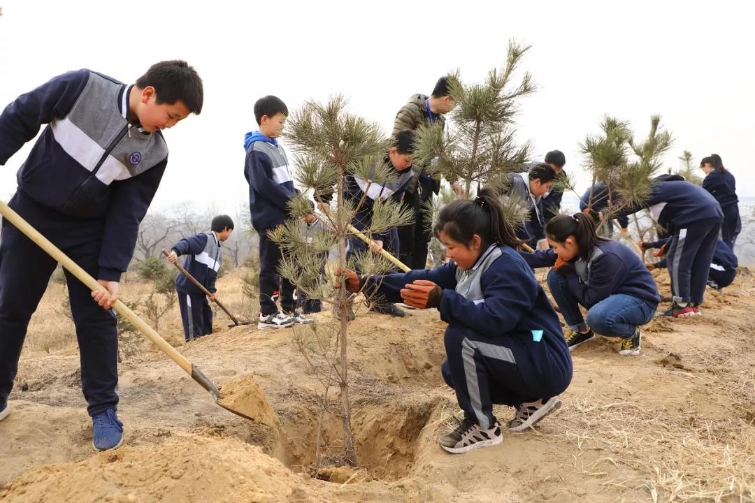 种植一份希望,梦想一片未来。以班级为单位,每班的学生把写有寄语的心愿卡系在了自己栽种的松树上。从学生微笑的脸庞上,我们能感受到他们满满的喜悦和成就感。